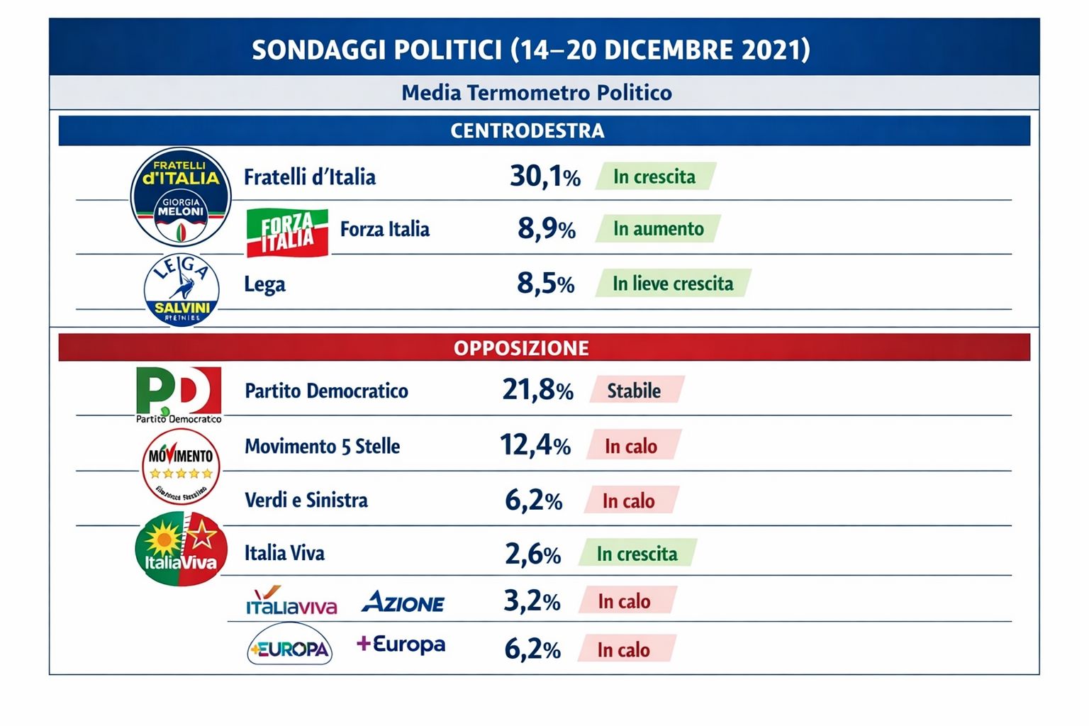 L’ultima media sondaggi, pubblicata da Termometro politico, relativa alla settimana tra il 14 e il 20 dicembre, mette a confronto le percentuali di consenso dei partiti rilevate da sette istituti: Swg, TP, Lab2101, Noto, Demopolis, Tecné, Ipsos. Da quanto emerge, Fratelli d’Italia è ancora primo partito, e sale sopra la soglia simbolica del 30%, passando al 30,1%. Un balzo in avanti evidente, rispetto al 29,8% rilevato il 13 dicembre.
