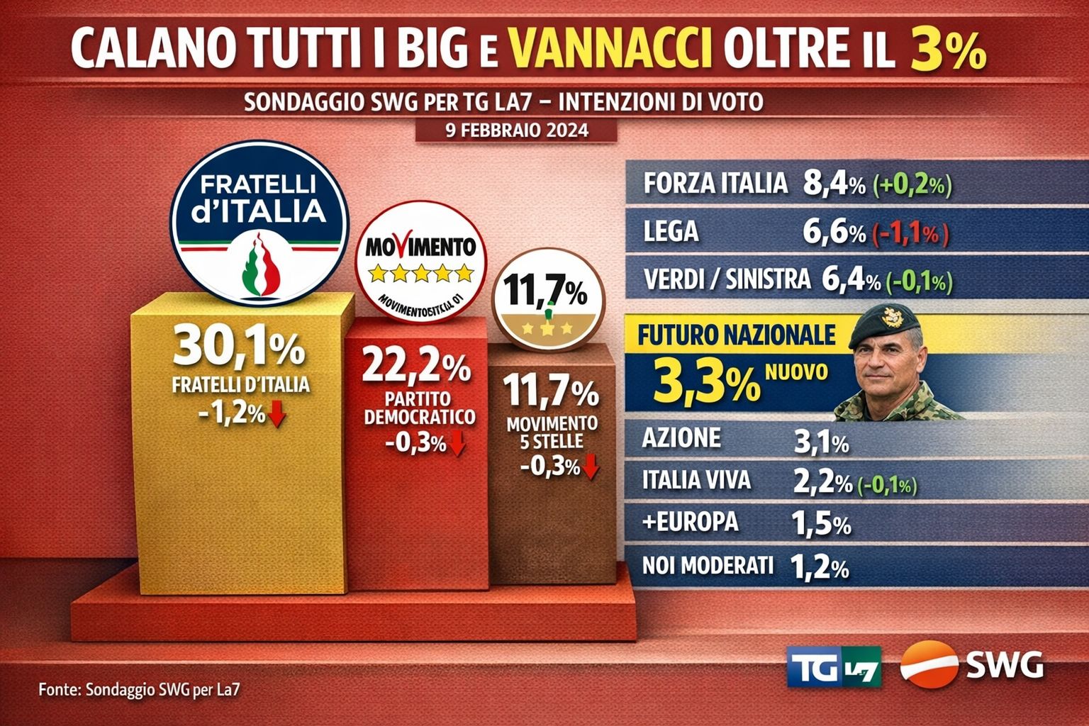 Fratelli d’Italia cala, frenano anche il Pd e il Movimento 5 Stelle. Futuro Nazionale, il partito di Roberto Vannacci, si presenta superando il 3% e, secondo i dati, toglie consensi a Fdi e alla Lega. E’ il quadro del sondaggio Swg per il Tg La7 che oggi, 9 febbraio, delinea le intenzioni di voto in caso di elezioni. Il podio è tutto ‘in rosso’ secondo l’ultimo rilevamento.