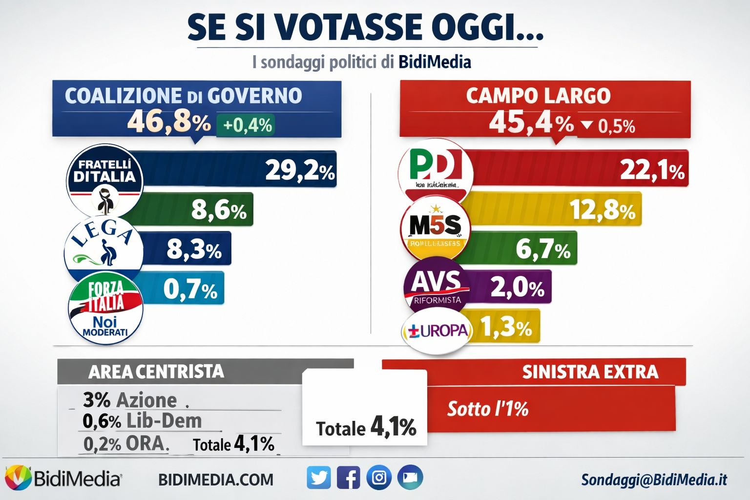 fammi immagine Ritornando a indagini e analisi molto più “terra terra”, i sondaggi politici di BidiMedia mostrano un andamento piuttosto graduale e consueto per i partiti italiani, seppur registrando un minimo allungo della coalizione di Governo, e al contempo un calo dell’area progressista che mira a sfidare Giorgia Meloni nelle Elezioni Politiche del prossimo anno.