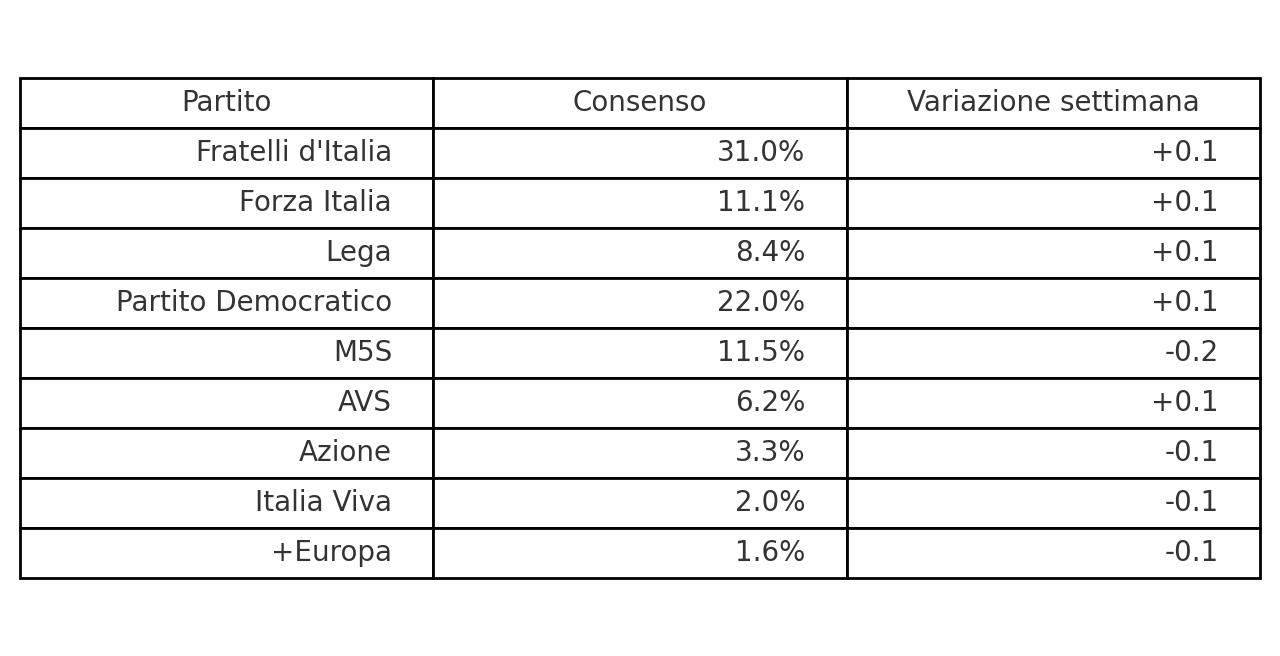 I partiti al governo risultano tutti in crescita, guadagnano lo 0,1% negli ultimi sette giorni: Fratelli d’Italia è il primo partito al 31%, e non va registrare variazioni nell’ultimo mese; Forza Italia stacca la Lega, e si porta all’11,1 (con un leggero calo rispetto al dato di un mese fa); la Lega di Salvini è all’8,4, e non si muove rispetto alla rilevazione effettuata un mese fa. Segno positivo anche per il Pd che sale al 22%, guadagnando lo 0,1 sulla settimana e recuperando +0,4% sul mese.