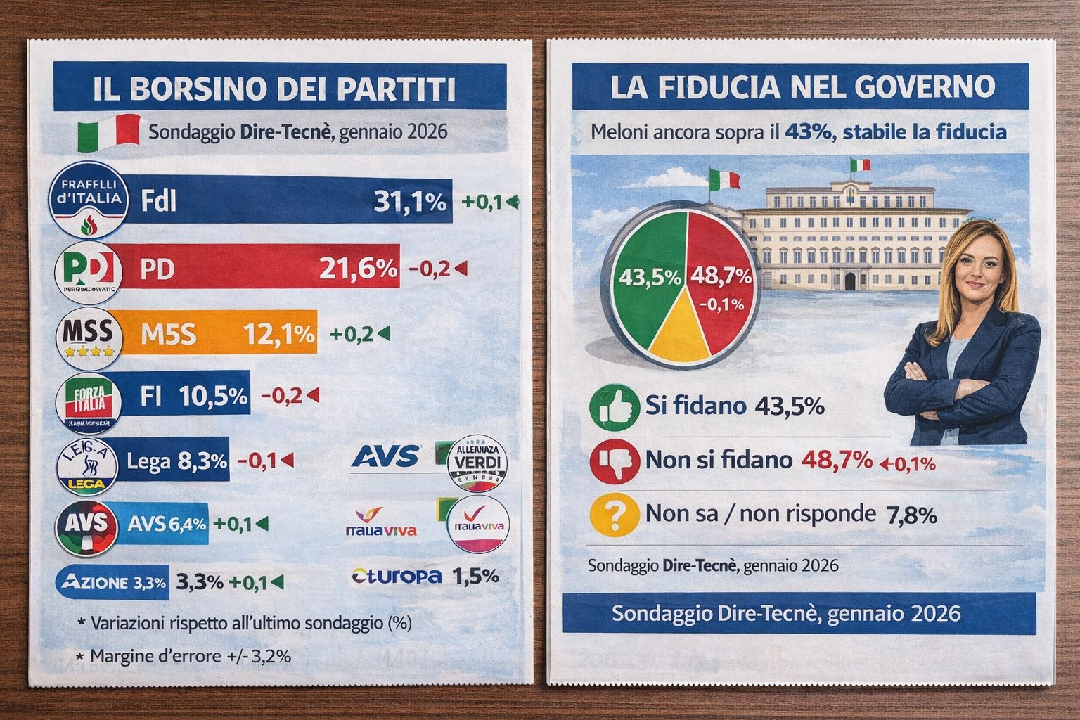 Il 2026 inizia bene per FdI, al 31,1%. Segue il Pd a quasi dieci punti di distanza. Il M5S è al 12,1% mentre FI si piazza al 10,5%, davanti alla Lega, che prende l’8,3%. Ecco i primo sondaggio dell’anno di Dire-Tecné.