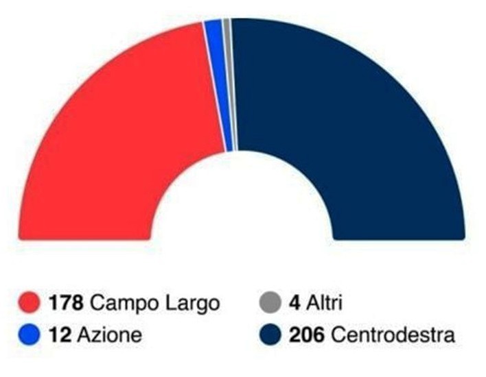 Alla Camera, con questi risultati e l’attuale legge elettorale, il centrodestra otterrebbe 206 seggi su un totale di 400. Per fare un paragone, nel 2022 ne prese ben 237. La maggioranza, quindi, diventerebbe di pochi deputati. Il centrosinistra arriverebbe a 178 seggi, con un distacco di 28. Azione ne avrebbe 12, e gli altri partiti complessivamente quattro.