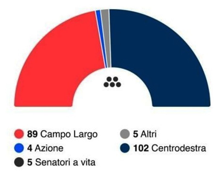 Al Senato il meccanismo per assegnare i seggi è più complicato, ma la sostanza non cambierebbe. Anzi, il centrodestra sarebbe anche più in difficoltà: 102 seggi su 205 (considerando anche i senatori a vita), uno in meno di quelli tecnicamente necessari per avere la maggioranza (furono 115 nel 2022). Il problema si potrebbe risolvere con il sostegno di un senatore del Maie, Movimento italiani all’estero, ma i numeri resterebbero limitati. Il centrosinistra arriverebbe a 89 senatori, Azione a quattro.
