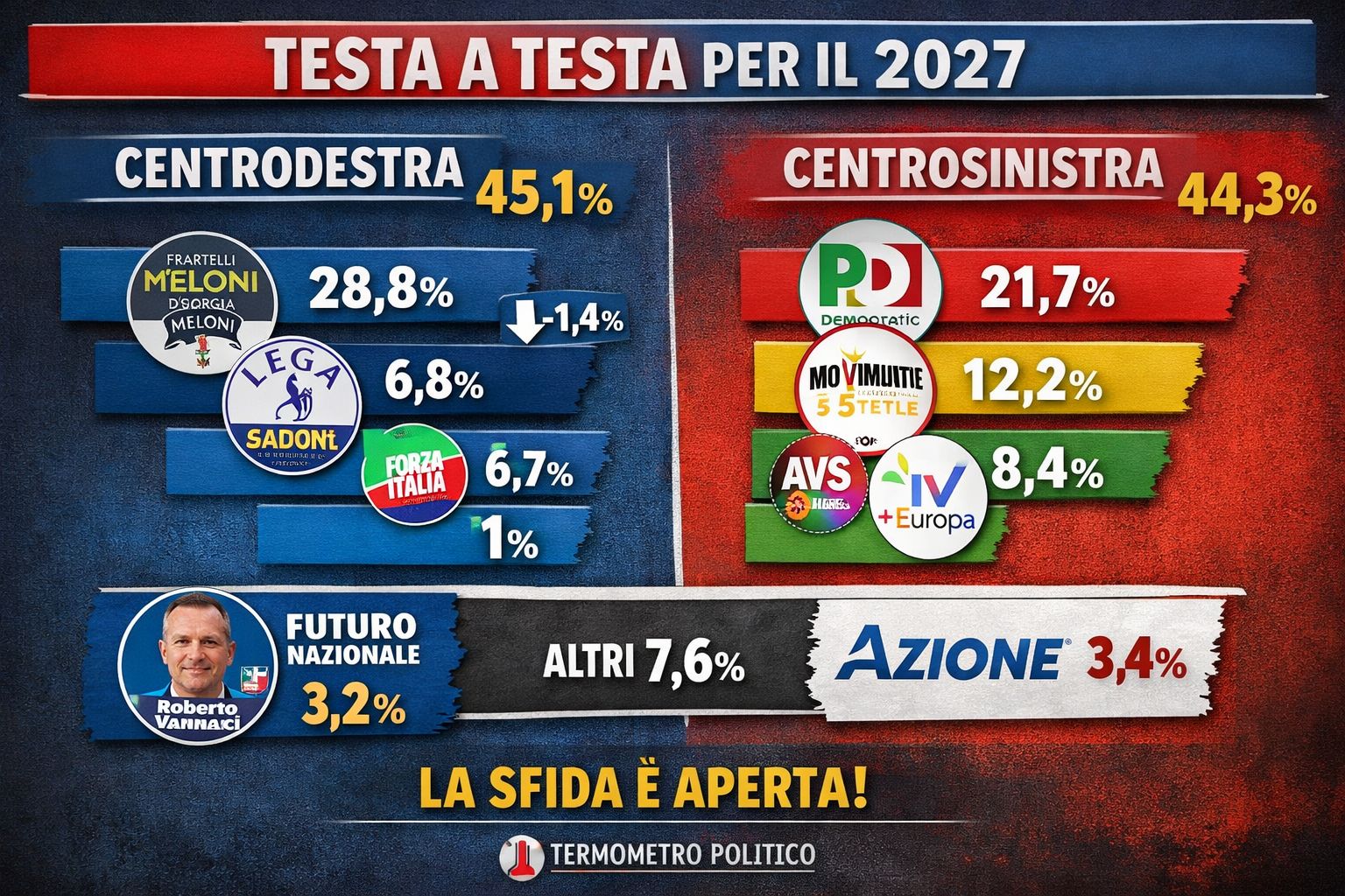 L’effetto del partito di Roberto Vannacci, Futuro nazionale, si vede ancora nei sondaggi: a un mese dal suo addio alla Lega, sia il Carroccio sia Fratelli d’Italia hanno perso parecchi voti. Certo, alle elezioni manca più di un anno e c’è tempo per rimediare, dal punto di vista di Salvini e Meloni. Ma resta il fatto che ora Pd, M5s, Avs, Italia viva e +Europa si trovano a circa mezzo punto di distanza dalla coalizione di maggioranza. Questo, almeno, è ciò che emerge dalla nuova media dei sondaggi politici realizzata da Termometro politico. In questa situazione di equilibrio, anche il referendum del 22 e 23 marzo può diventare uno spartiacque. E il dibattito sulla legge elettorale diventa cruciale per la destra.