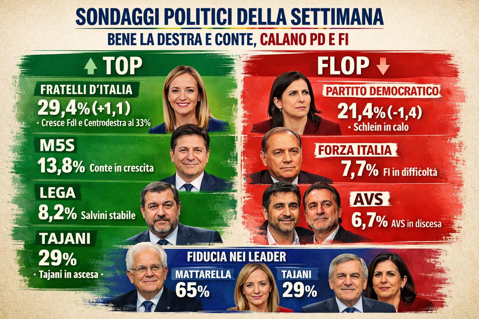 Per Giorgia Meloni e per FdI il dato di fiducia degli elettori intervistati è ancora altissimo, con il 29,4% complessivo che tengono ogni rivale a debita distanza, a cominciare dal Pd di Elly Schlein che compie la peggior performance elettorale della settimana: i Dem crollano al 21,4% perdendo netti l’1,4%, con viceversa nel campo largo progressista un andamento “contario” del principale alleato della Segretaria, quel Giuseppe Conte che assieme al M5s recuperano terreno fino al 13,8%. La Lega tiene ancora “botta” e conferma la buona crescita in generale della destra italiana: Salvini all’8,2% allunga su Forza Italia di Tajani, in discesa netta al 7,7%.