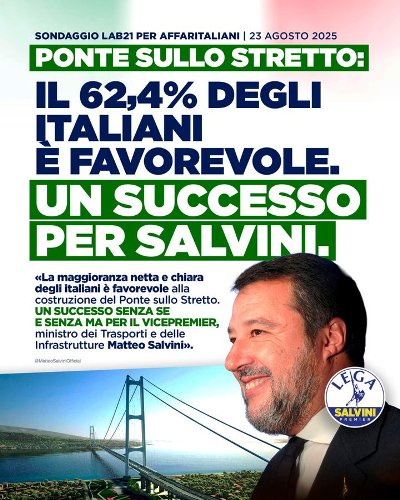 Allargando l’orizzonte sui medesimi sondaggi politici Lab 21.01, le recenti intenzioni di voto qui raccolte mostrano un importante balzo della Lega a +1% in poche settimane, con più del 9% di consensi nazionali, staccando i rivali-alleati di Forza Italia all’8%. Come ha scritto sui propri profili social lo stesso Segretario del Carroccio, quel 62% di italiani favorevoli al Ponte è un onore che la maggioranza degli italiani sia allineato all’opera pubblica più importante dopo l’Autostrada A1 nell’immediato dopoguerra.