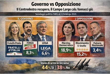 Secondo i sondaggi politici raccolti entro il 23 febbrai 2026, Fratelli d’Italia di Giorgia Meloni rimane ampiamente il primo partito del Paese con un 29,8% che mantiene stabili le preferenze di questi ultimi mesi: mentre i dossier internazionali imperversano, la tenuta del Governo viene ripagata dall’elettorato, che mantiene di fatto stabili anche Forza Italia all’8,3% e la Lega di Salvini, addirittura data in crescita fino al 6,6% dopo lo strappo dell’ex generale.