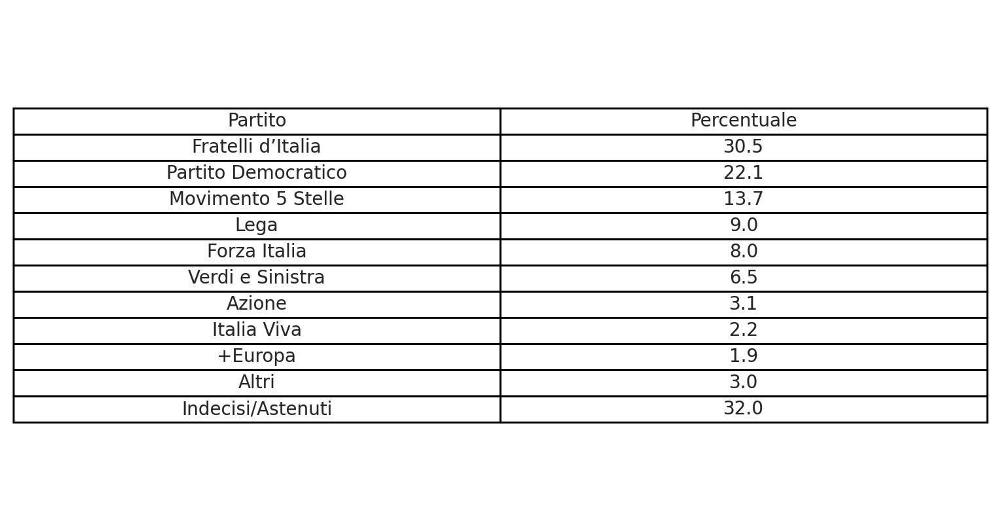 Anche il Movimento 5 stelle guadagna terreno, portandosi al 13,7%, un risultato che lo mantiene terza forza del Paese e che segnala una fase di lieve ma costante recupero. Più statico, invece, il centrodestra nelle sue altre componenti: la Lega rimane al 9% senza variazioni, mentre Forza Italia si attesta all’8%, anch’essa stabile. Sul fronte progressista, Verdi e Sinistra segnano un arretramento, scivolando al 6,5%, un calo che conferma le difficoltà di questo schieramento a intercettare nuovi consensi.
