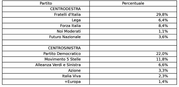 Si segnala anche la crescita Italia Viva di Matteo Renzi, al 2,3% (+0,1). Scendono invece +Europa, al 1,4% (in calo dello 0,1%), e Noi Moderati di Lupi, con l’1,1% (in calo dello 0,1%). Le altre liste raccolgono complessivamente il 3,3%, un dato rimasto stabile rispetto al precedente sondaggio.