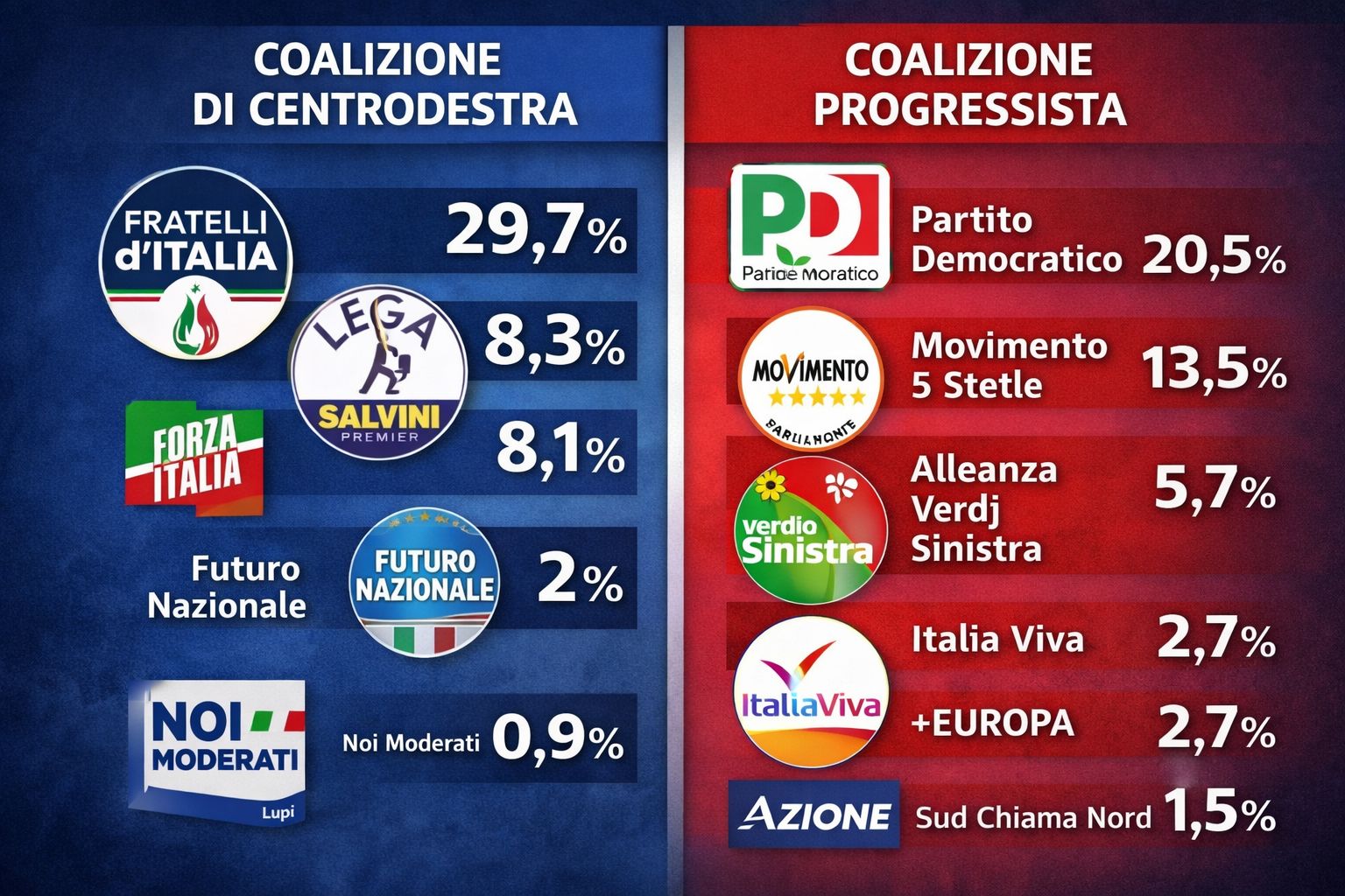 Fratelli d’Italia guida il gruppo con il 29,7%, recuperando consensi rispetto alla scorsa settimana: la Lega di Salvini si conferma secondo partito della coalizione, nonostante l’uscita di scena di Vannacci, con l’8,3% davanti all’8,1% d Forza Italia. Al 2% di Futuro Nazionale (in calo dello 0,3%) e allo 0,9% Noi Moderati con Lupi completano per il momento coalizione di Centrodestra che punta alla riconferma alle urne tra un anno.