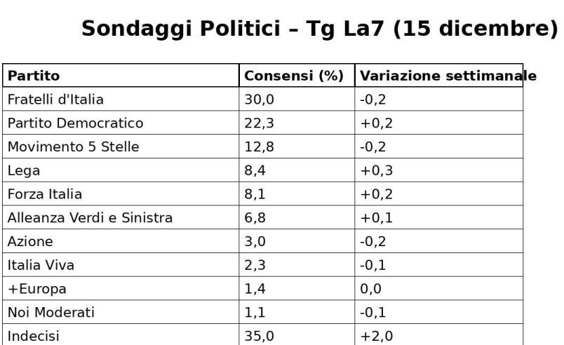 Con i sondaggi del 15 dicembre pubblicati dal Tg La7 siamo alla terza settimana in cui Fratelli d’Italia – che solo il mese scorso aveva toccato il suo picco – cala nelle intenzioni di voto.