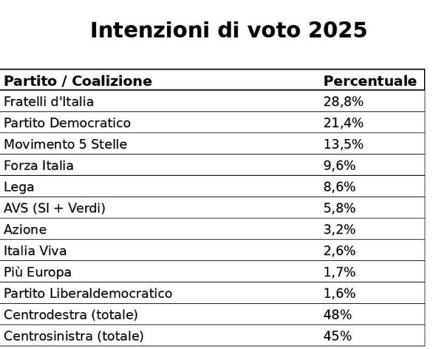 A seguire Azione al 3,2%, Italia Viva al 2,6%, Più Europa all’1,7% e Partito Liberaldemocratico all’1,6%. Dunque sostanzialmente ad oggi il centrodestra aggregato (compreso Fdi, Fi, Lega e Noi Moderati) si attesterebbe al 48%, il centrosinistra (Pd, M5S, AVS, Italia Via e Più Europa) al 45, i partiti centristi (Azione e Partito Liberaldemocratico) al 4,9%.