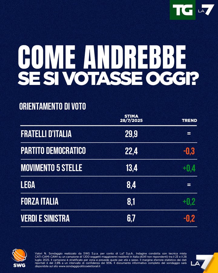 25 Novembre 2025I dati del rilevamento Swg per il Tg La7.