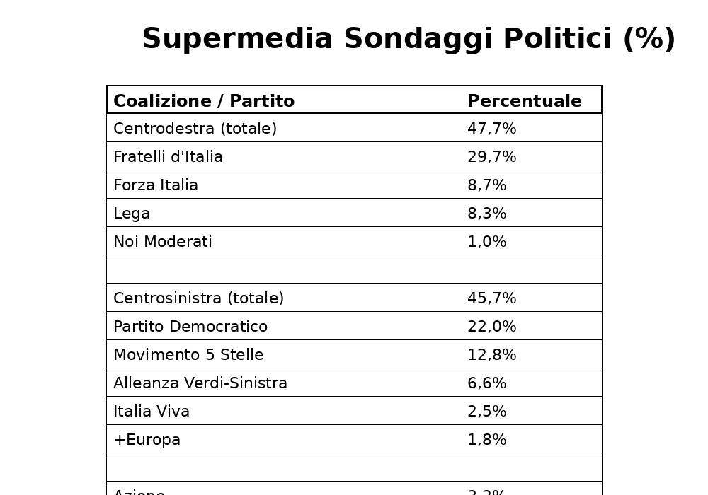 La nuova Supermedia dei sondaggi politici registra che nelle ultime due settimane Fratelli d’Italia ha avuto un calo mentre il Movimento 5 stelle è cresciuto parecchio.