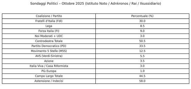 24 Novembre 2025Le nuove rilevazioni Piepoli ridisegnano gli equilibri: FdI resta in testa ma perde mezzo punto, Pd in calo e Lega/Forza Italia in risalita. Nel campo progressista Conte domina, Schlein arretra e Salis cresce ma contesta lo strumento delle primarie. Anche il sondaggio YouTrend di pochi giorni prima conferma lo stesso scenario.