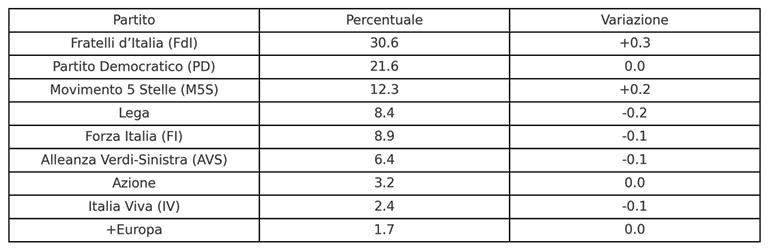 Alleanza Verdi-Sinistra è al 6,4% dopo una leggera flessione. Questo fa sì che, nel complesso, le tre forze principali dell’ipotetico ‘campo largo’ restino più o meno stabili. Con un consenso che, sommato aritmeticamente, arriva al 40,3%, Pd-M5s-Avs sono lontani in questo momento dal poter sfidare da soli il centrodestra.