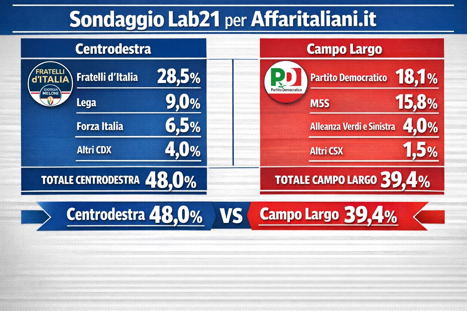 FdI è ancora in testa nei sondaggi. Il Pd resta molto distante, a più di dieci punti. Il partito di Meloni traina l’intera coalizione di centrodestra che totalizza il 48% contro il 39,4% del campo largo. Ecco l’ultimo sondaggio di Lab21 per Affariitaliani.it.