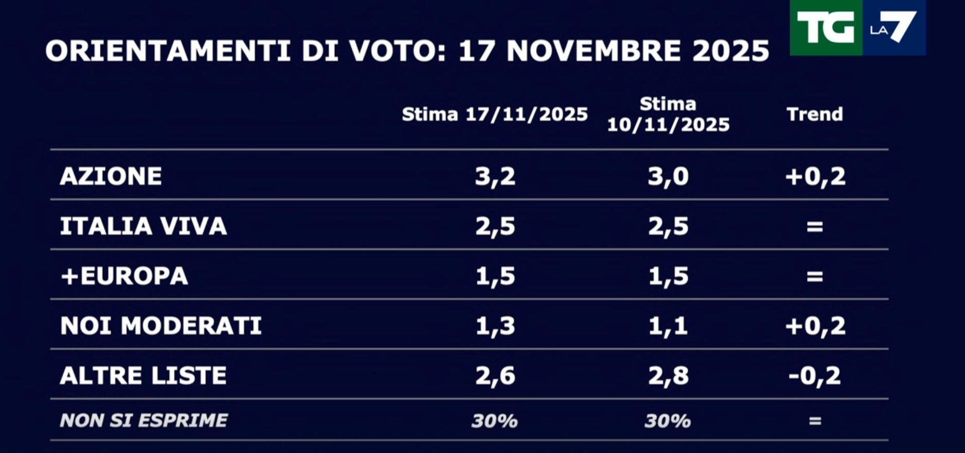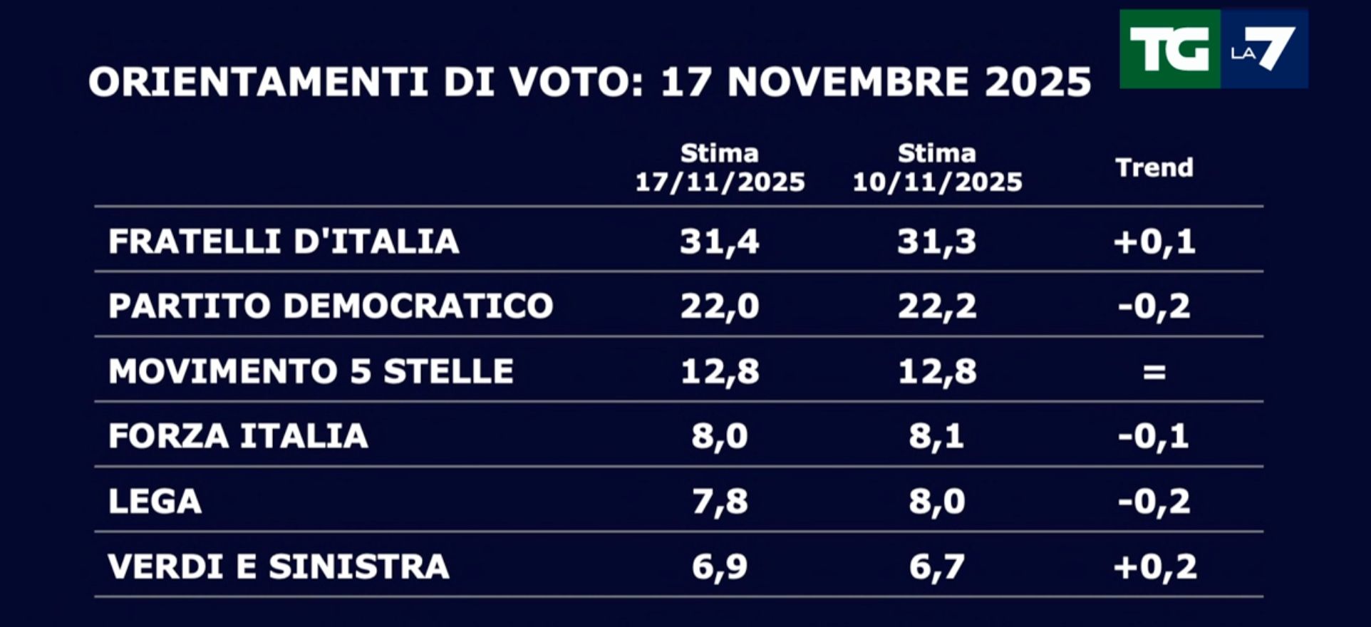 14 Novembre 2025Tonfi per FdI e Lega: ride solo il M5S, giù anche Pd e AVS.