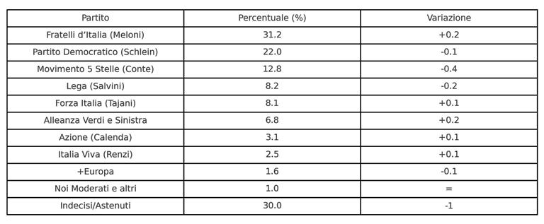 Nel fronte centrista, Azione e Italia Viva registrano entrambe un piccolo progresso, salendo rispettivamente al 3,1% e al 2,5%. Segno negativo invece per +Europa, che scende all’1,6%. Restano stabili Noi Moderati e le altre liste minori, mentre cala di un punto la quota degli indecisi e astenuti, ora al 30%.