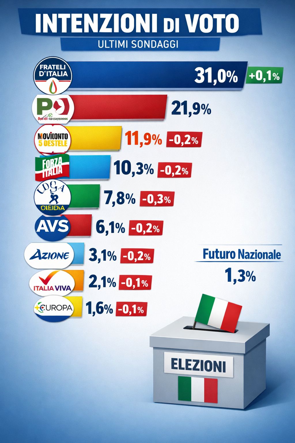 Quanti voti prendono i partiti FdI risale al31%, il Pd è stabile, mentre tutti gli alti partiti calano.