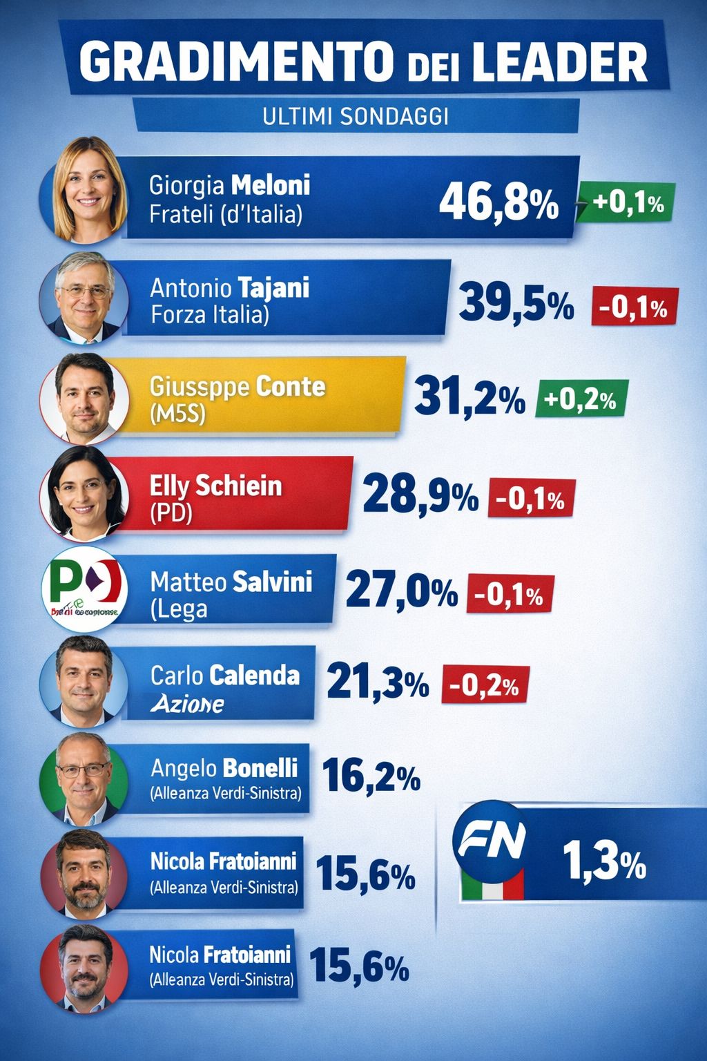 Passiamo ora ai consensi ai leader. Giorgia Meloni resta saldamente al primo posto nella classifica dei leader più apprezzati con il 46,8% delle preferenze. In seconda posizione il leader di FI e vicepremier, Antonio Tajani con il 39,5% (-0,1%). Al terzo, in ripresa, il presidente del M5S Giuseppe Conte che guadagna lo 0,2% e si porta al 31,2%. Segue la segretaria del Pd Elly Schlein che riporta un leggero calo, dello 0,1%, e scende al 28,9%. Il leader della Lega Matteo Salvini si conferma quinto al 27,0% (-0,1). Chiudono la classifica il leader di Azione Carlo Calenda (21,3%), Angelo Bonelli (al 16,2%) e Nicola Fratoianni (al 15,6%) di Alleanza Verdi-Sinistra.