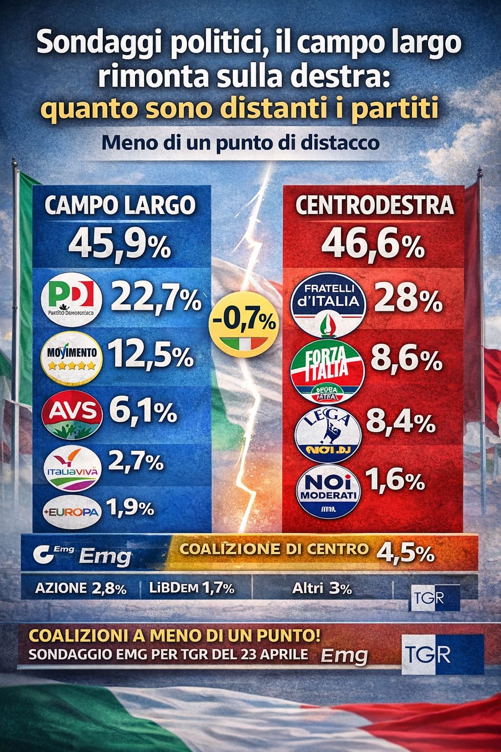 Si assottiglia la distanza tra il campo largo e il centrodestra. Con un leggero passo avanti delle opposizioni e un leggero passo indietro della maggioranza, ora il distacco è di meno di un punto percentuale. In questo scenario, potrebbero diventare anche più ‘pesanti’ i voti che vanno al centro. Lo mostra il sondaggio politico di Emg per il Tg3, in cui Fratelli d’Italia è la prima forza del Paese. Cosa che però potrebbe non bastare, di fronte ai consensi di Pd, M5s, Avs, Italia viva e +Europa.