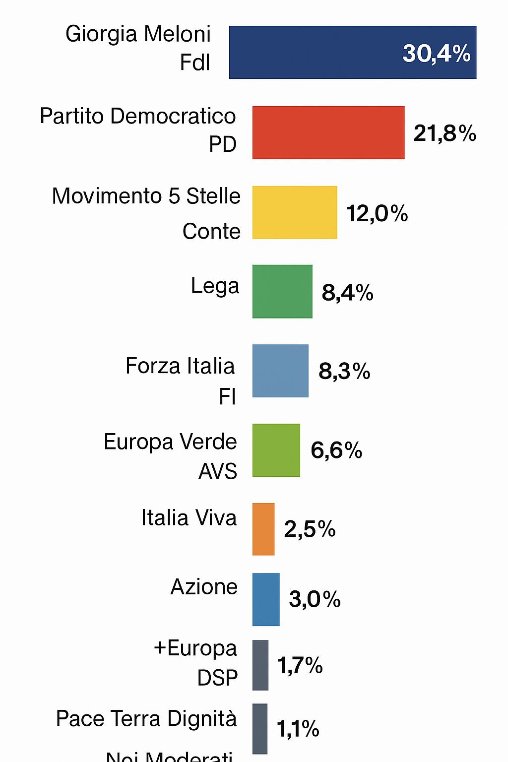 Il partito guidato da Giorgia Meloni conferma una crescita costante negli ultimi mesi, mentre Pd e Movimento 5 Stelle registrano un calo dei voti. Stabili restano Lega, Forza Italia e Alleanza Verdi-Sinistra, secondo i dati raccolti da Termometro Politico.