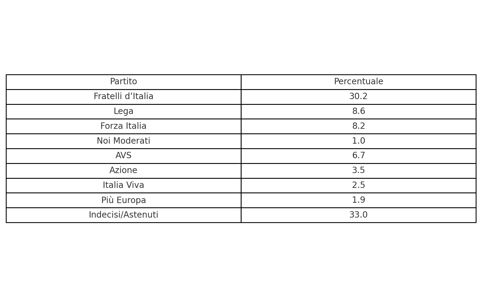 Un dato significativo riguarda la quota di cittadini che non si esprime: il 33% degli intervistati dichiara di non sapere per chi votare o di non volerlo fare. Si tratta di un aumento rispetto al sondaggio di luglio, quando la percentuale era al 29%. Questa crescita dell’astensionismo indica una difficoltà dei partiti a intercettare una parte consistente dell’elettorato, che continua a rimanere distante dall’offerta politica.