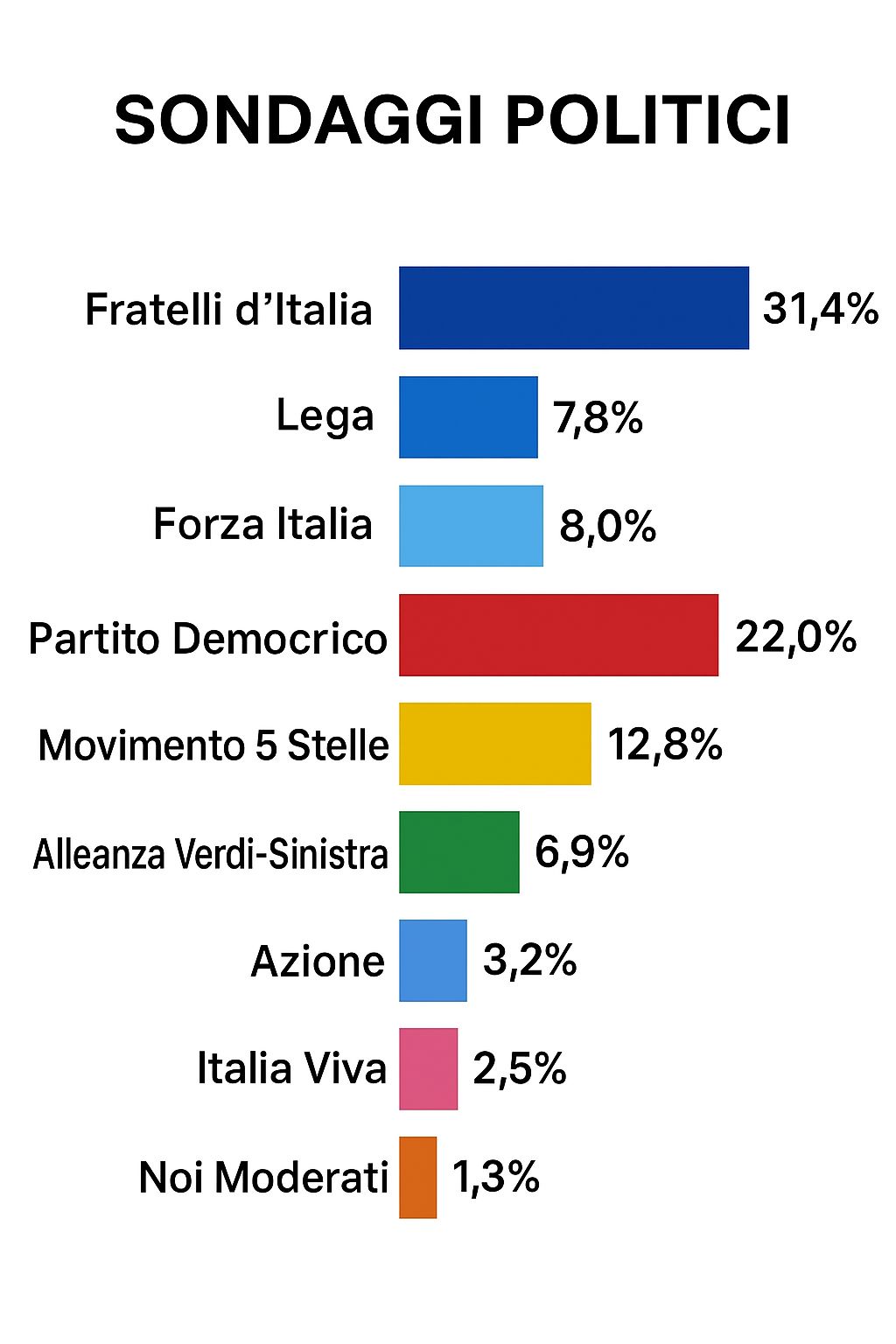 Torniamo ai sondaggi. Il Movimento 5 Stelle è stabile, al 12,8%. Cresce solamente Alleanza Verdi-Sinistra al 6,9% (+0,2%). Tra i partiti di centro, Azione è al 3,2% (+0,2%), seguito da Italia Viva e +Europa, che restano fermi, rispettivamente al 2,5% e all’1,5%. Chiude Noi Moderati, che raccoglie l’1,3% (+0,2%).