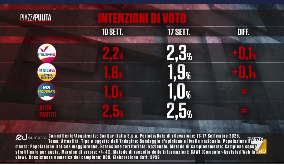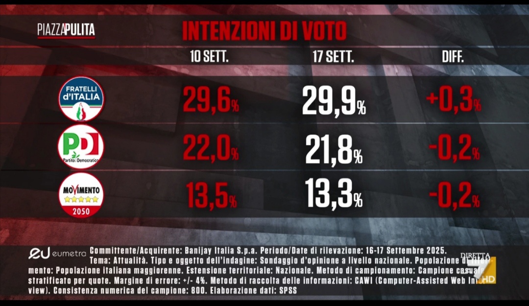 L’ultimo sondaggio diffuso da PiazzaPulita e realizzato da Eumetra per Banijay Italia restituisce un quadro politico in movimento, ma senza scosse clamorose. Le intenzioni di voto raccolte tra il 16 e il 17 settembre 2025 segnalano infatti solo piccoli spostamenti tra i principali partiti, con Fratelli d’Italia che continua a rafforzare la propria posizione di primo partito. Il Partito Democratico e il Movimento 5 Stelle segnano invece un lieve calo, mentre al centro e tra le formazioni minori prevale la sostanziale stabilità.