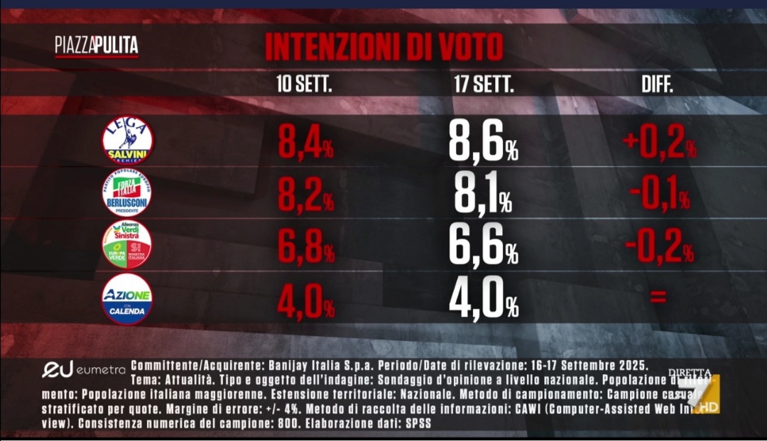 In conclusione, il sondaggio Eumetra di metà settembre 2025 offre un’immagine di sostanziale stabilità. Fratelli d’Italia resta al comando senza rivali vicini, mentre PD e M5S non sfondano. La Lega prova a rialzarsi, gli altri partiti si muovono tra frazioni di punto e i piccoli cercano di non scomparire. Nessun terremoto politico, insomma, ma piuttosto piccoli segnali che, se confermati, potrebbero trasformarsi in dinamiche più rilevanti nei prossimi mesi.