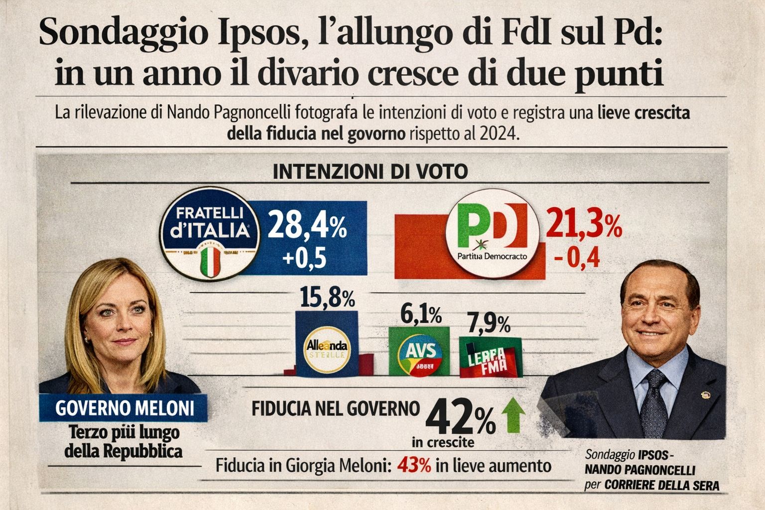 La rilevazione di Nando Pagnoncelli fotografa le intenzioni di voto e registra una lieve crescita della fiducia nel governo rispetto al 2024.
