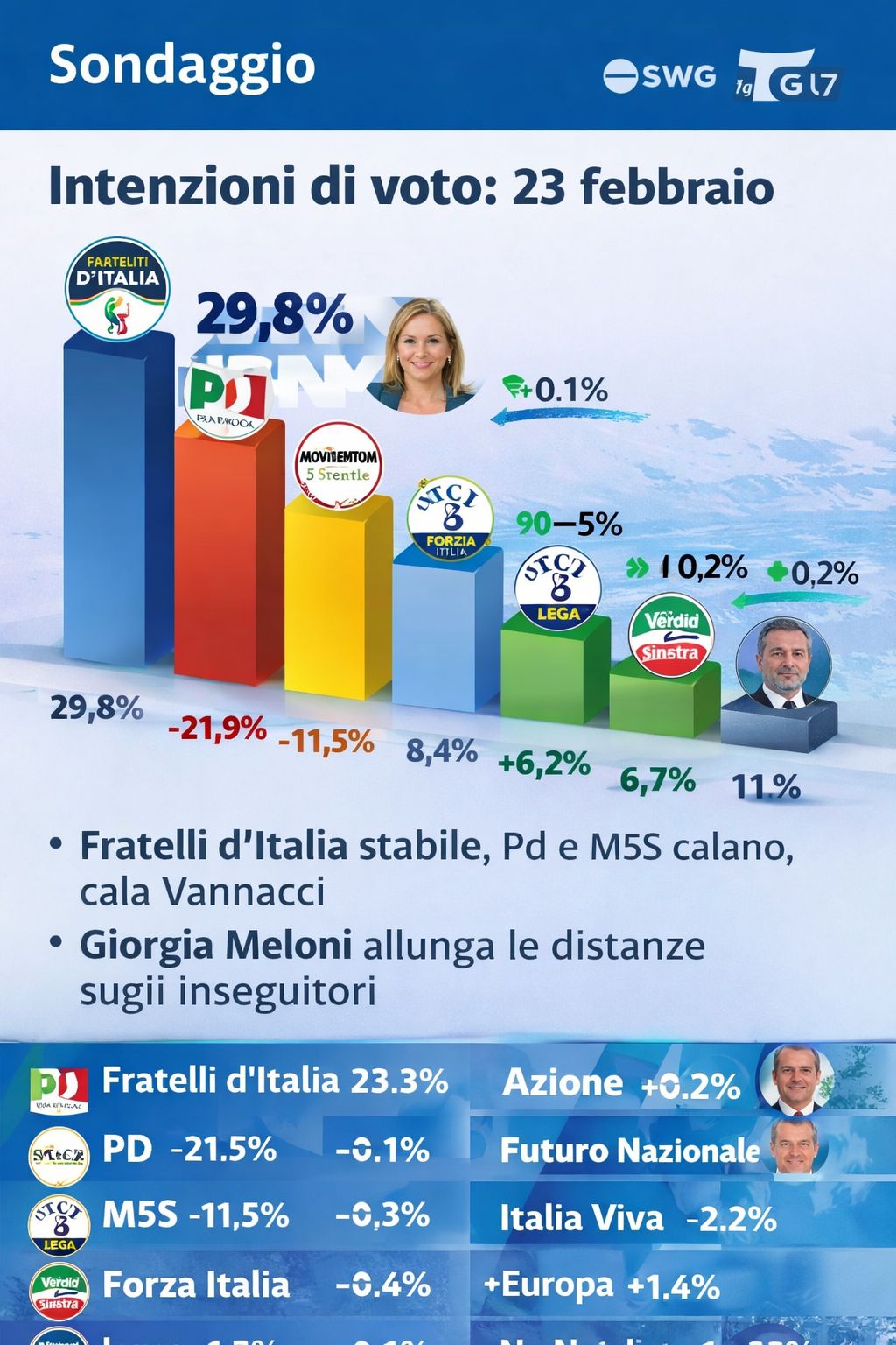 23 Febbraio 2026Fdi e Lega perdono quasi un punto in due mesi.