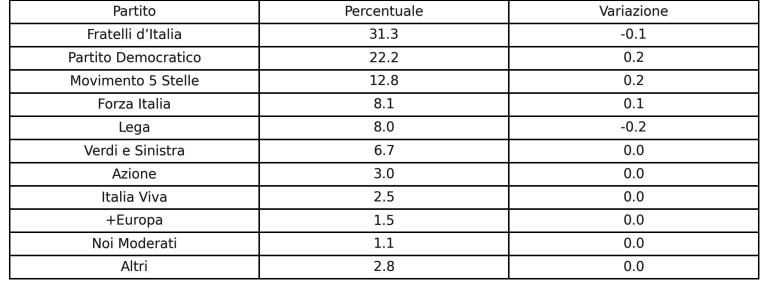 La formazione guidata dalla presidente del Consiglio Giorgia Meloni si conferma ampiamente primo partito, nonostante i passi avanti di Pd e M5S. Il Pd di Elly Schlein cresce dello 0,2% e arriva al 22,2%. Il Movimento 5 Stelle di Giuseppe Conte guadagna lo 0,2% e si attesta al 12,8%. Passo avanti anche di Forza Italia, dall’8% all’8,1%, con sorpasso sulla Lega. Il Carroccio scende, passando dall’8,2% all’8%.