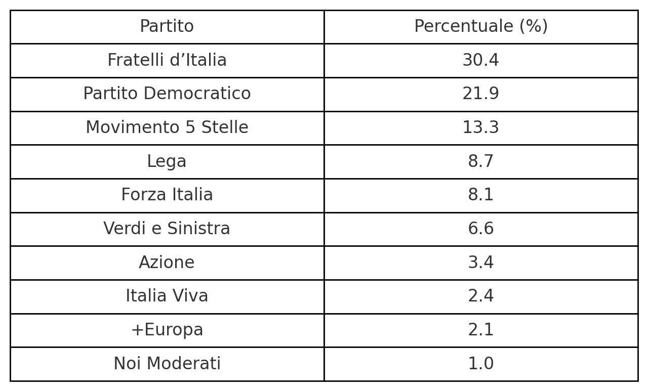 Fratelli d’Italia cresce e va in fuga, Pd e M5S calano. E’ il quadro del sondaggio politico Swg per il Tg La7, con le intenzioni di voto in caso di elezioni oggi, 15 settembre 2025. La formazione guidata da Giorgia Meloni si conferma ampiamente primo partito, allungando rispetto alla concorrenza. Fratelli d’Italia guadagna lo 0,4% e sale al 30,4%. Il Partito Democratico di Elly Schlein cede lo 0,3% e scende al 21,9%. Stesso passo indietro per il Movimento 5 Stelle guidato da Giuseppe Conte, ora al 13,3%.