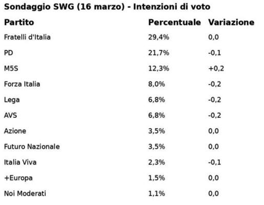 Il rilevamento diffuso oggi 16 marzo evidenzia che Fratelli d’Italia, sempre ampiamente primo partito, rimane stabile al 29,4%, senza cambiamenti rispetto ad una settimana fa. La formazione guidata dalla presidente del Consiglio, Giorgia Meloni, aumenta il vantaggio sul Pd. Il partito della segretaria Elly Schlein cede lo 0,1% e scende al 21,7%. In ascesa il M5S di Giuseppe Conte, che guadagna lo 0,2% e sale al 12,3%. Stesso passo indietro per Forza Italia, Lega e Alleanza Verdi e Sinistra: perdono tutti lo 0,2%. Forza Italia scende all’8%, Lega e AVS sono appaiate al 6,8%.