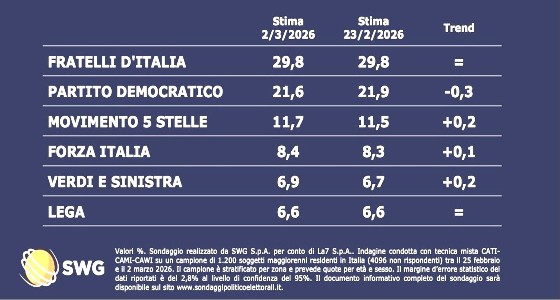 Fratelli d’Italia è stabile, il Pd cala e il M5S cresce. Il partito di Roberto Vannacci supera Azione e stacca Italia viva. E’ il nuovo quadro delineato dal sondaggio Swg per il Tg La7 che fotografa le intenzioni di voto, oggi 2 marzo 2026, in caso di elezioni. Fratelli d’Italia, ampiamente primo partito, rimane fermo al 29,8% e, pur senza crescere, allunga. La formazione guidata dalla presidente del Consiglio Giorgia Meloni guadagna terreno sul Pd della segretaria Elly Schlein: i dem cedono lo 0,3% e scendono al 21,6%. Sul terzo gradino del podio cresce il Movimento 5 Stelle di Giuseppe Conte, che guadagna lo 0,2% e si attesta all’11,7%.