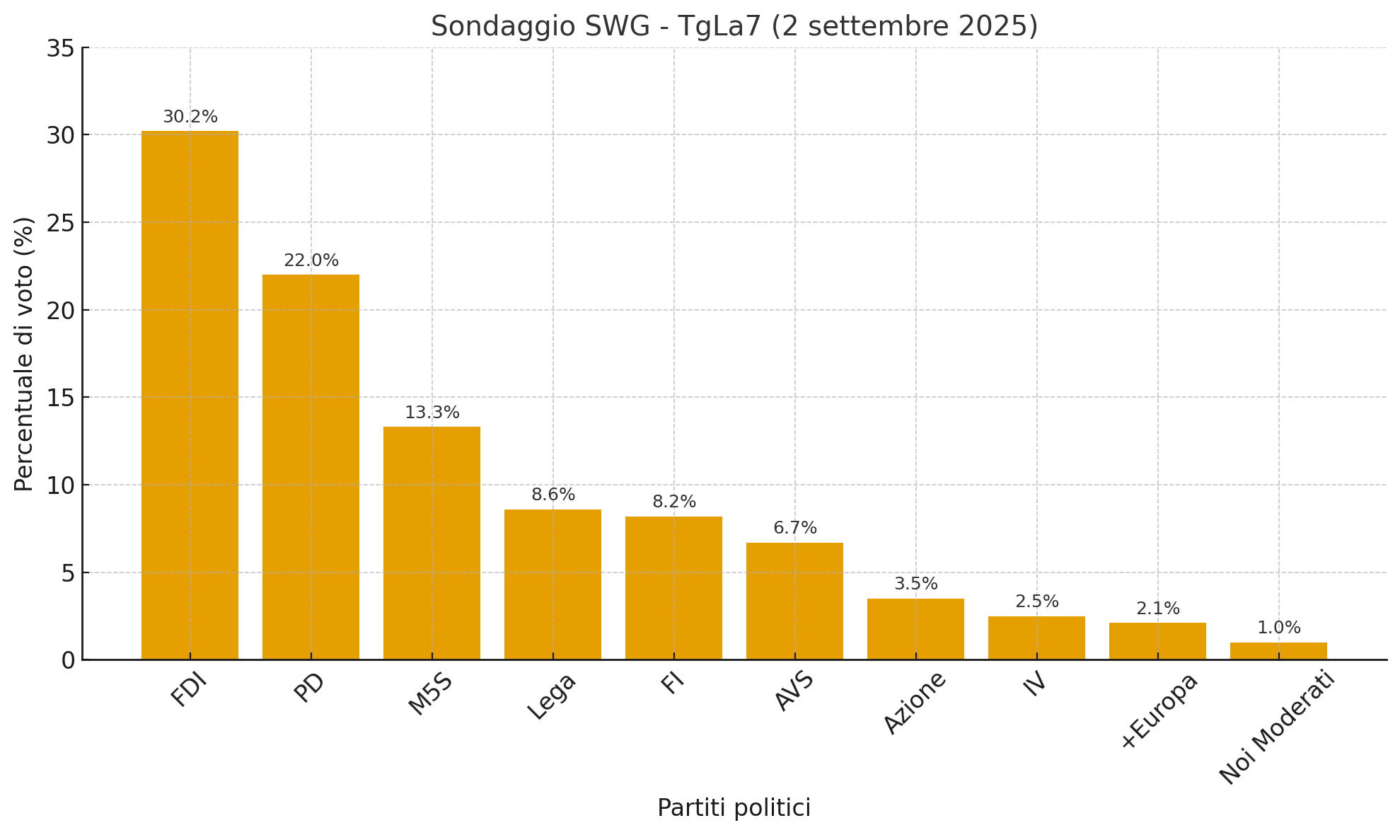 Tornano gli ultimi sondaggi politici. Secondo i dati raccolti da Swg per il TgLa7 di Enrico Mentana, ecco chi vincerebbe le elezioni se si votasse oggi. Chi cresce e chi cala nel confronto tra i soggetti rispetto a quasi un mese fa, con i sondaggi fermi dal 27 luglio, in base alle rilevazioni pubblicate martedì 2 settembre 2025, tra Giorgia Meloni (Fratelli d’Italia), Matteo Salvini (Lega), Elly Schlein (Pd), Giuseppe Conte (M5S), Antonio Tajani (Forza Italia), Matteo Renzi (Italia Viva), Riccardo Magi (+Europa), Carlo Calenda (Azione) e gli altri soggetti politici.