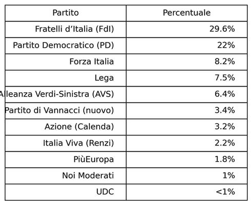 Vannacci primo stop, Pd -8% da FdI, Lega 7,5%: