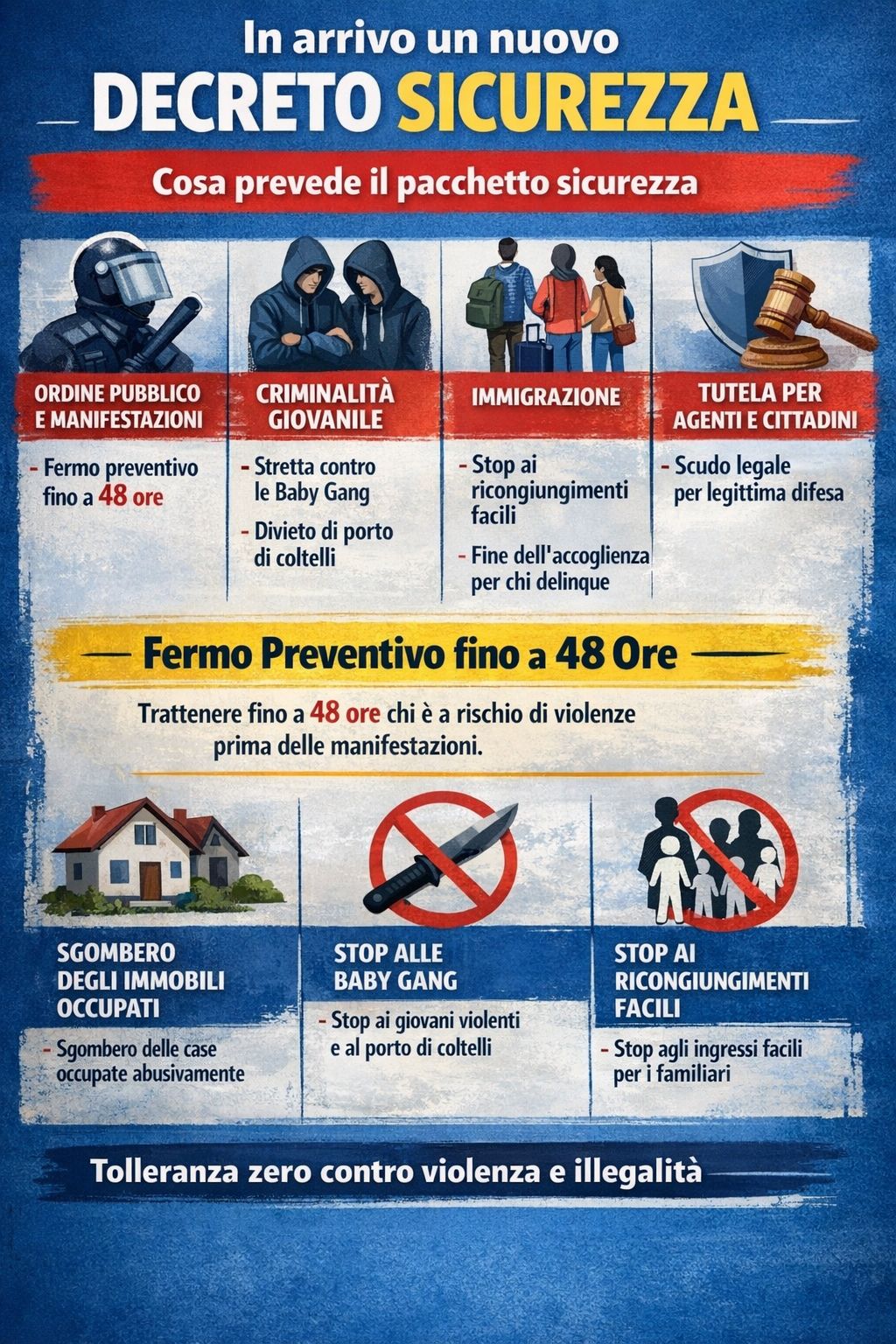 “Noi siamo pronti”, ha detto poi Salvini nei giorni scorsi, “non per la cronaca delle ultime ore ma perché è giusto che ci siano dentro tutte le norme che servono, compresa ad esempio quella che prevede lo sgombero di tutti gli immobili occupati abusivamente, non solo della prima casa, e quella che taglia i ricongiungimenti familiari, perché un conto è accogliere chi scappa dalla guerra, un conto è accogliere anche gli altri 20 amici e parenti e compresa quella che toglie il sostegno a chi è oggi a spese degli italiani e commette un reato. Quindi conto che il decreto sicurezza sia completo al 100%, compresa la tutela per gli agenti, lo stop all’iscrizione automatica nel registro degli indagati”.