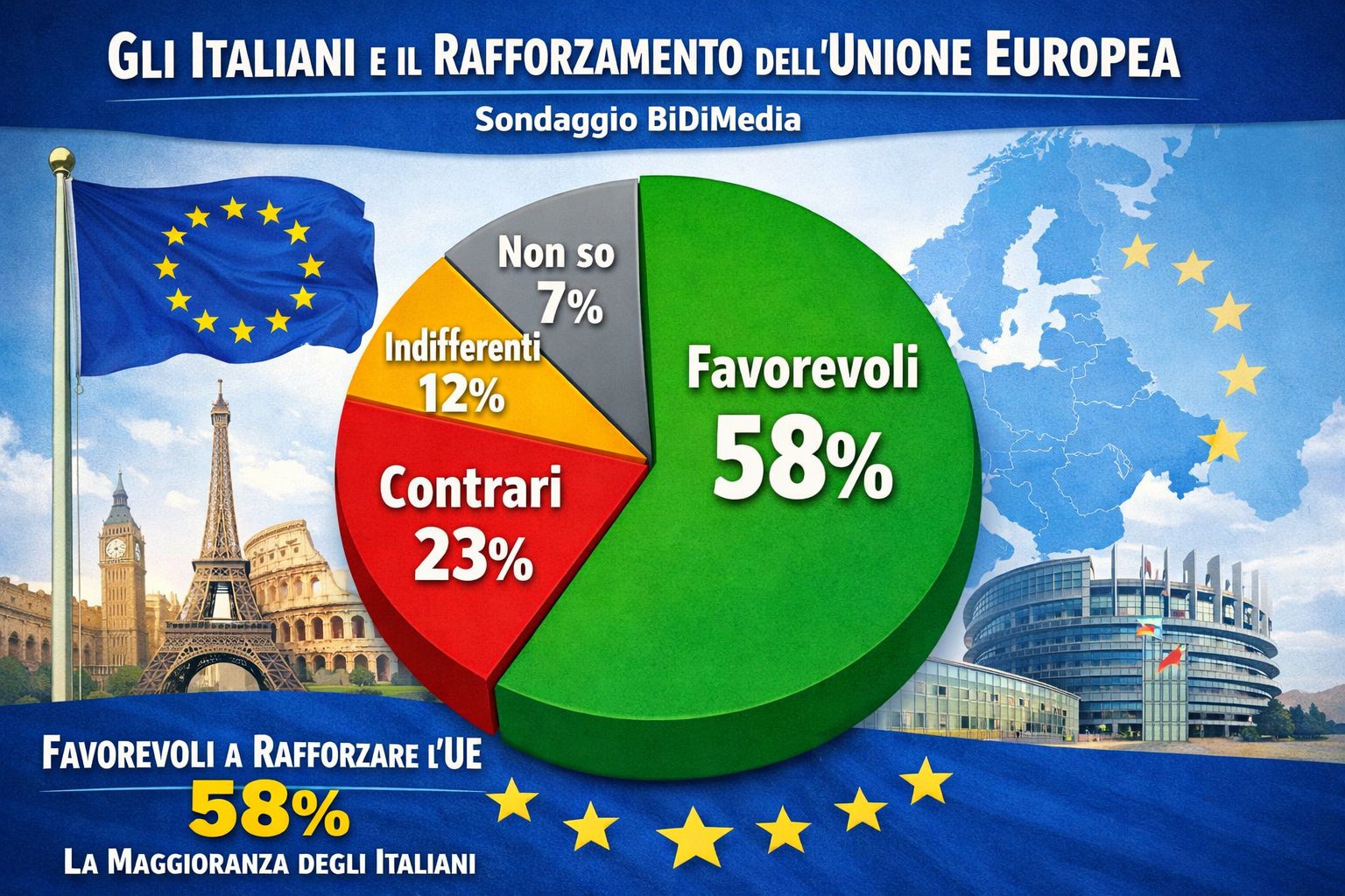 Tra i dati emersi, spicca un risultato particolarmente significativo legato al futuro dell’Unione Europea. Alla domanda “Secondo lei l’Ue dovrebbe diventare una reale unione federale, continuare a funzionare con l’assetto attuale o sciogliersi?”, ben il 61% degli intervistati si è espresso a favore della creazione degli “Stati Uniti d’Europa”. Il sostegno maggiore a questa opzione proviene dagli elettori di Partito Democratico, Alleanza Verdi-Sinistra e Movimento 5 Stelle, un risultato che trova spiegazione negli attuali equilibri geopolitici precari.