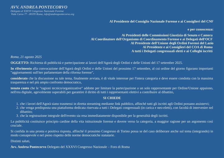 Per questo ho inviato formale richiesta a CNF (e per conoscenza, alle Commissioni Giustizia di Camera e Senato, all’UOFL, al COA ROMA e all’OCF) per: